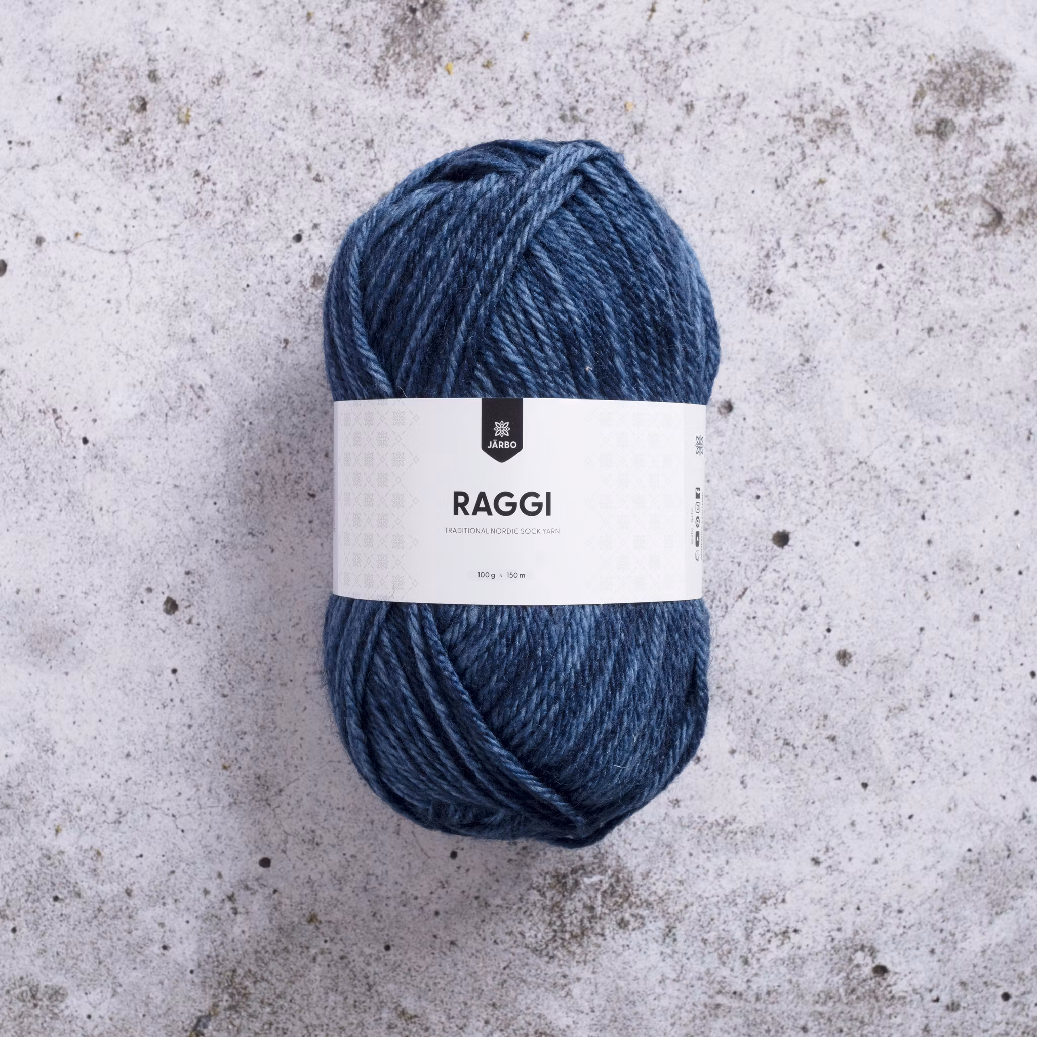 Raggi är sockgarnernas urfader och Järbos stolthet, spunnet första gången på spinneriet i Järbo.Detta mjuka och slitstarka sockgarn i melerade blå nyanser passa