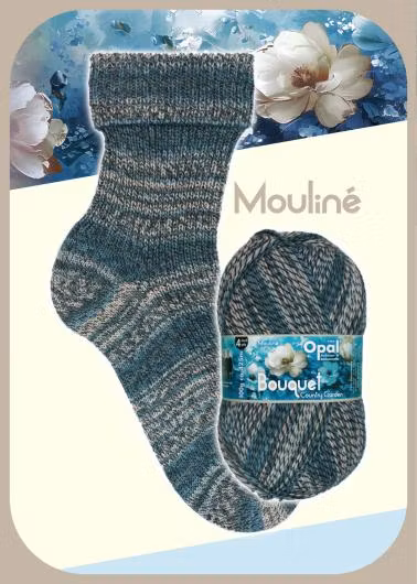 Opal Bouquet Mouliné är ett klassiskt 4-trådigt sockgarn från Opal med vackra, mjukt melerade färgskiftningar (mouliné-effekt) som ger liv åt stickningen utan a