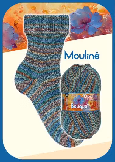 Opal Bouquet Mouliné är ett klassiskt 4-trådigt sockgarn från Opal med vackra, mjukt melerade färgskiftningar (mouliné-effekt) som ger liv åt stickningen utan a