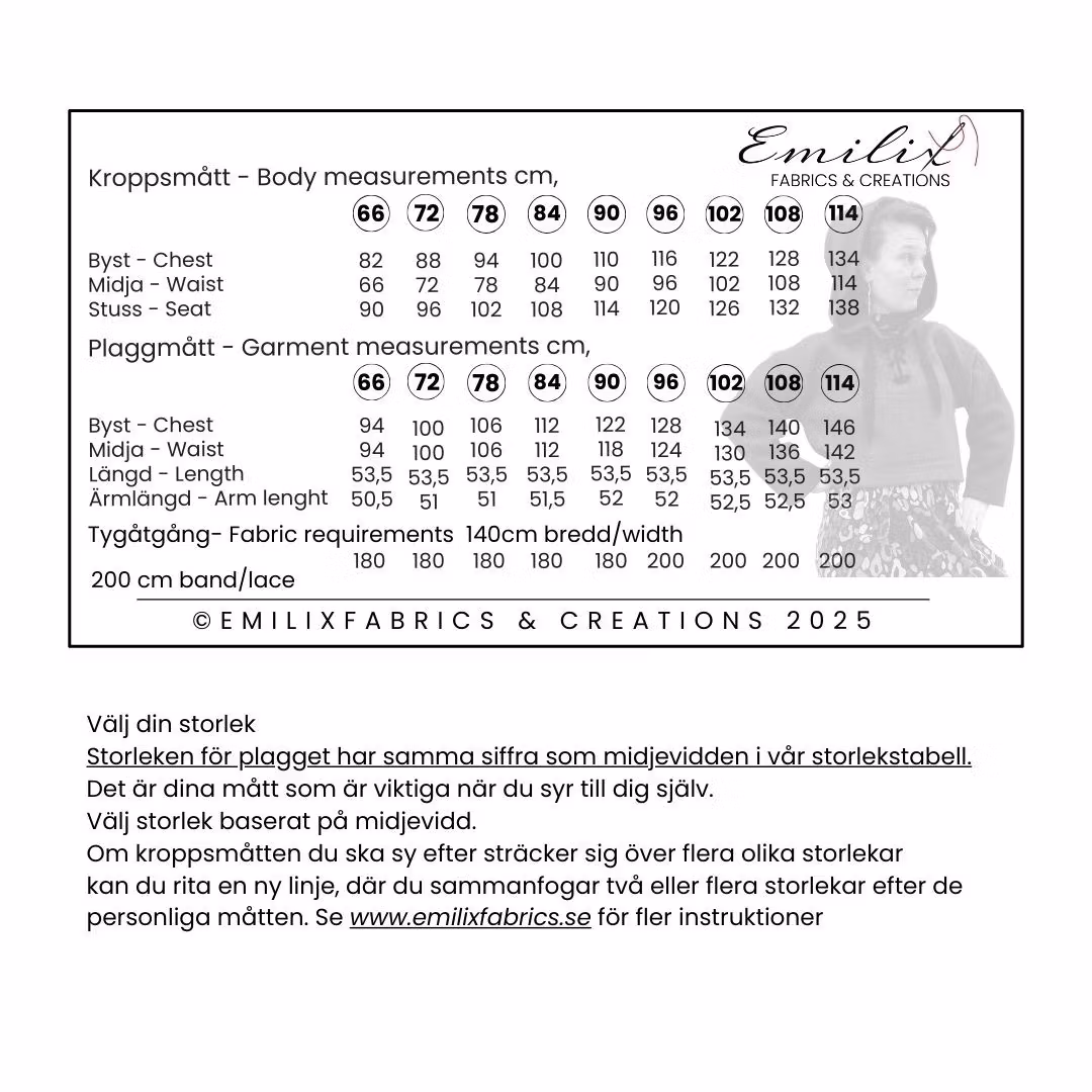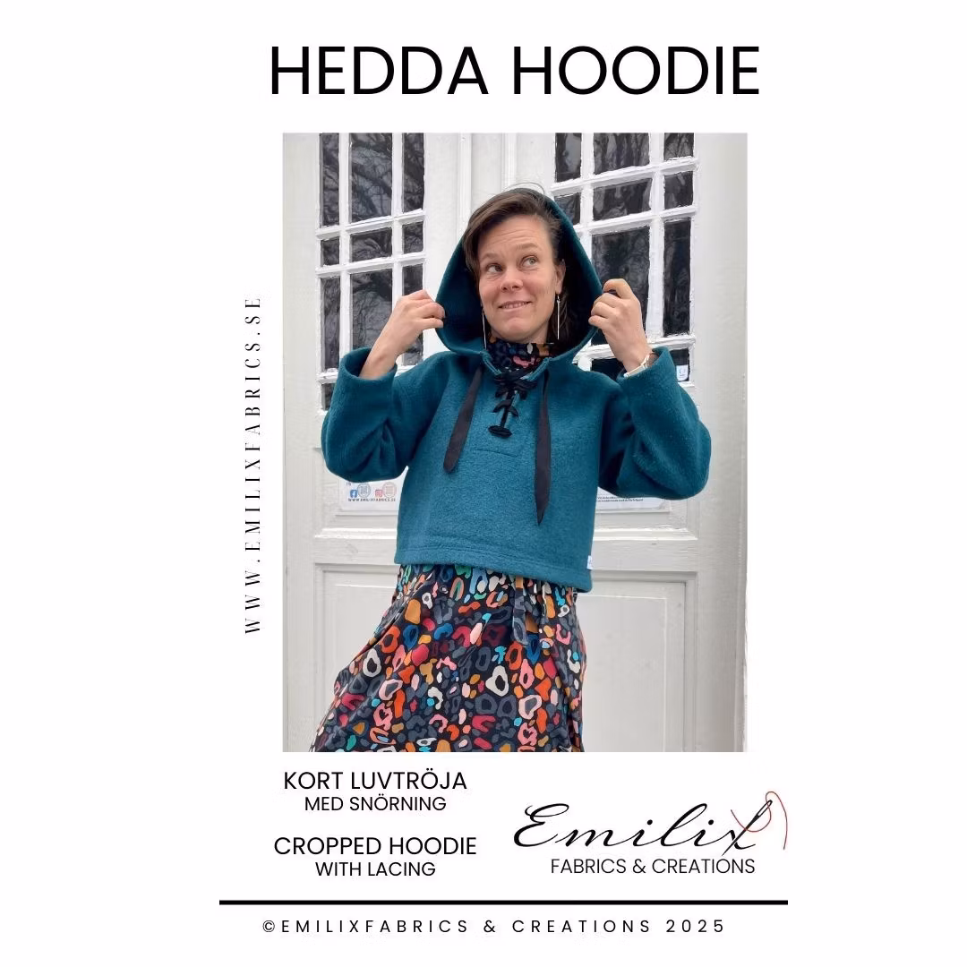 Hedda tryckt mönster från Emilix creations.Plagget är en kort, oversize luvtröja med snörning – designad för en lös och ledig känsla. Designad att sy den i