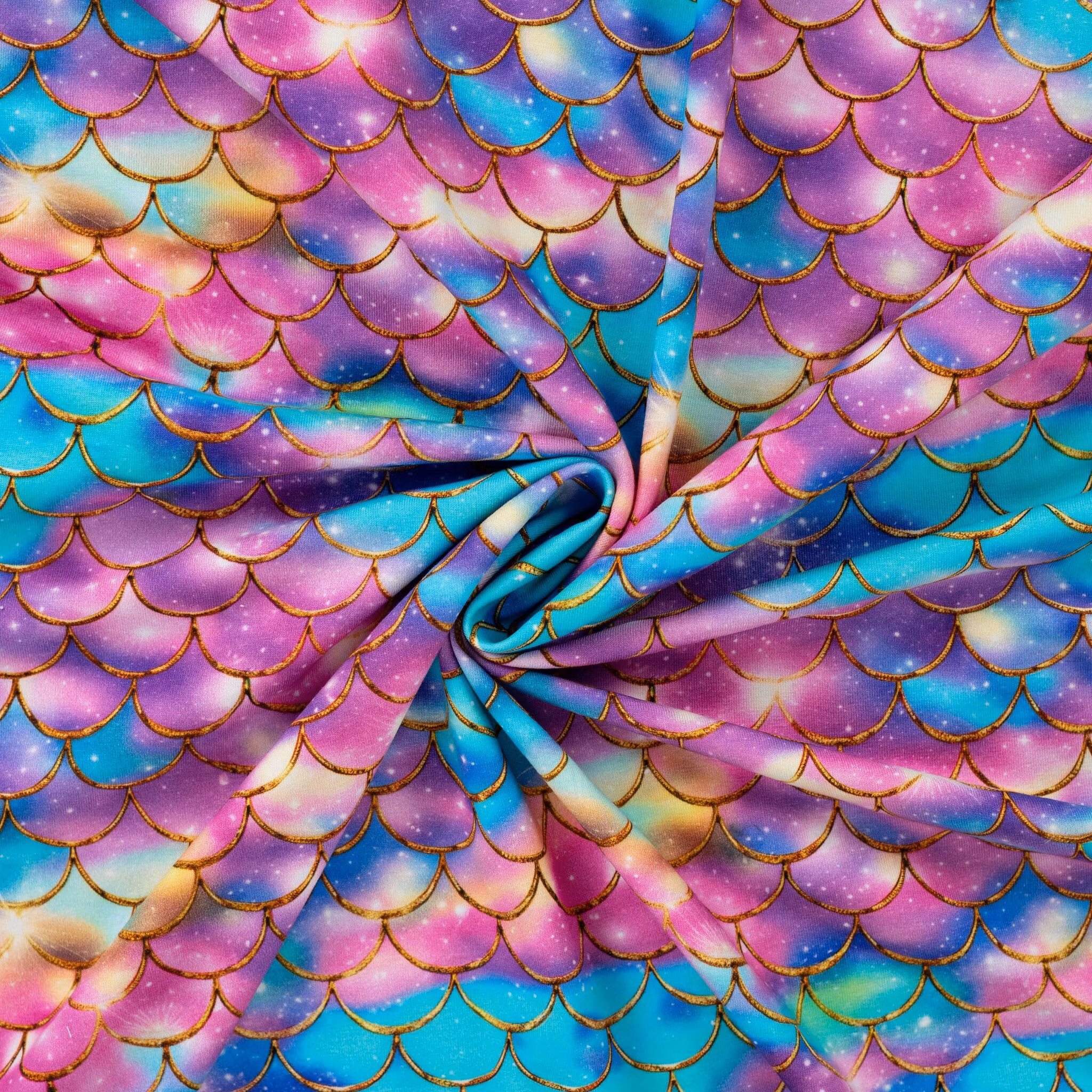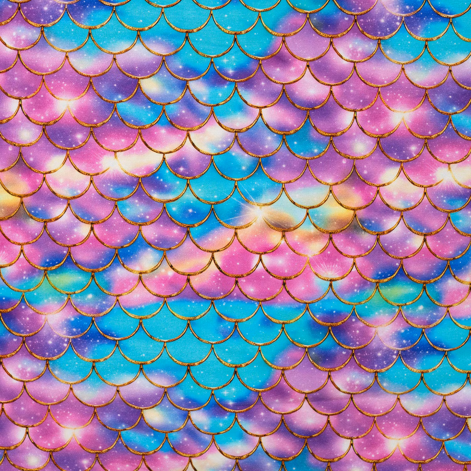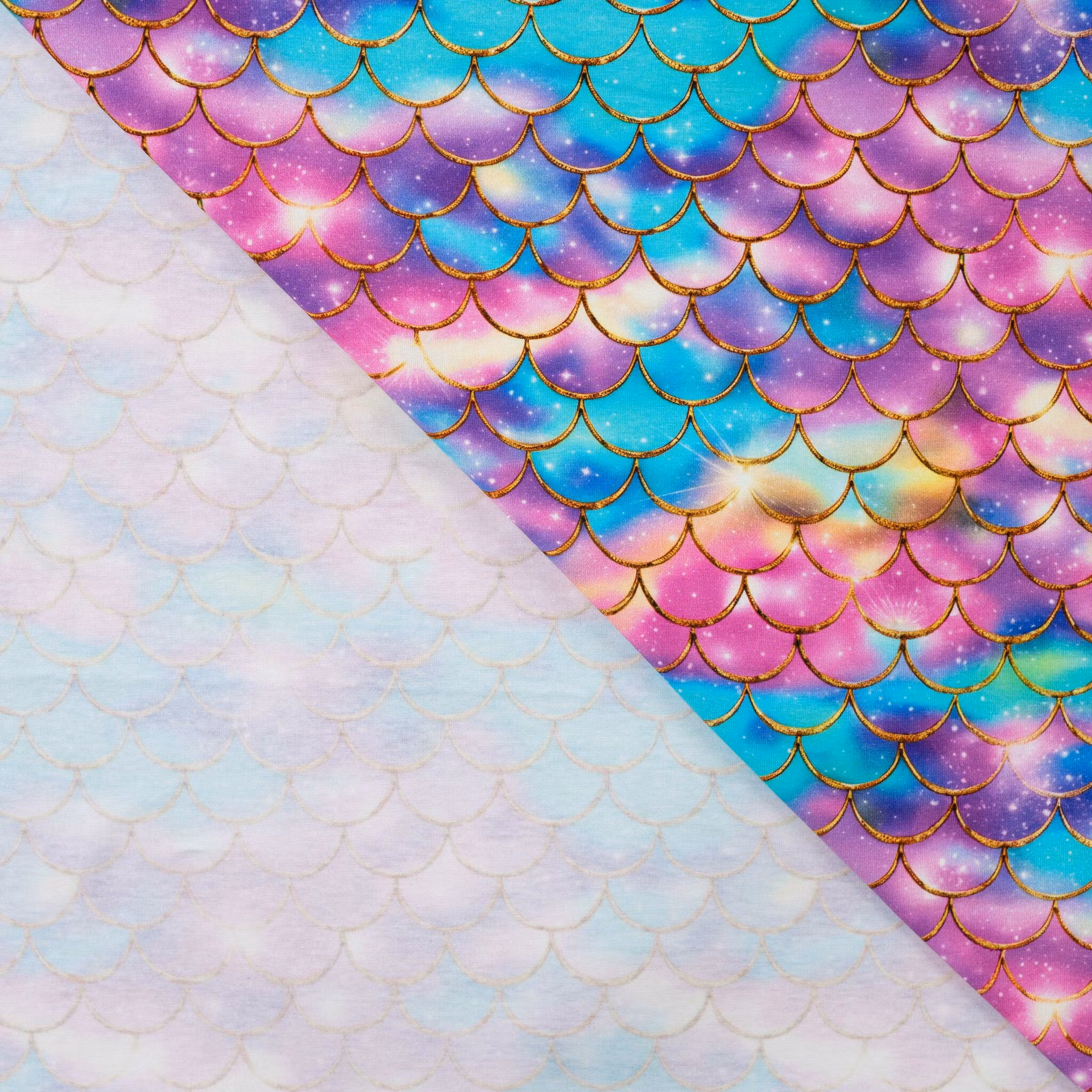 Ett sagolikt trikåtyg med fjällmönster i skimrande regnbågsnyanser av turkos, rosa, lila och blått, inramat av gyllene konturer som ger ett exklusivt och glittrande intryck. Mönstret för tankarna till drakar, sjöjungfrur och fantasivärldar – ett tyg som verkligen sticker ut.