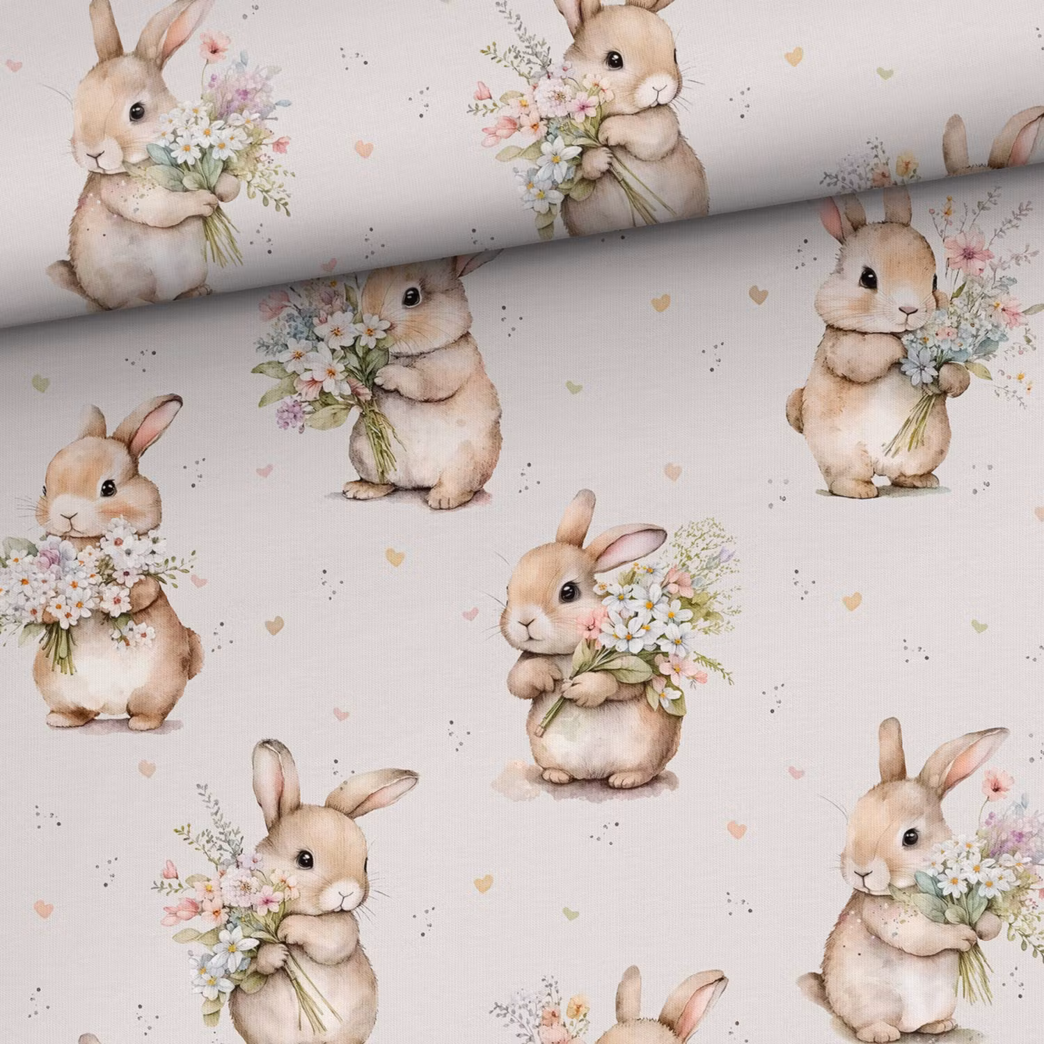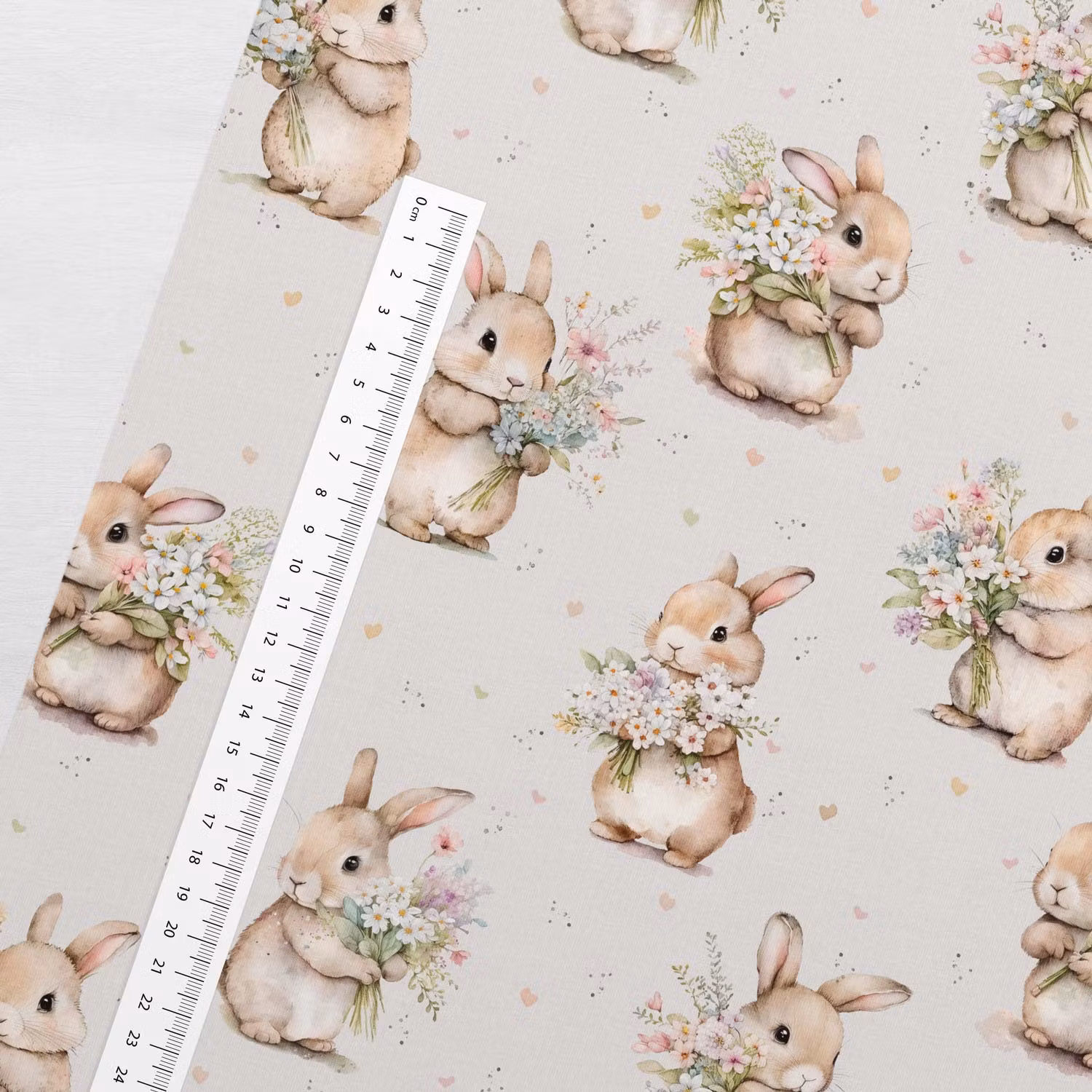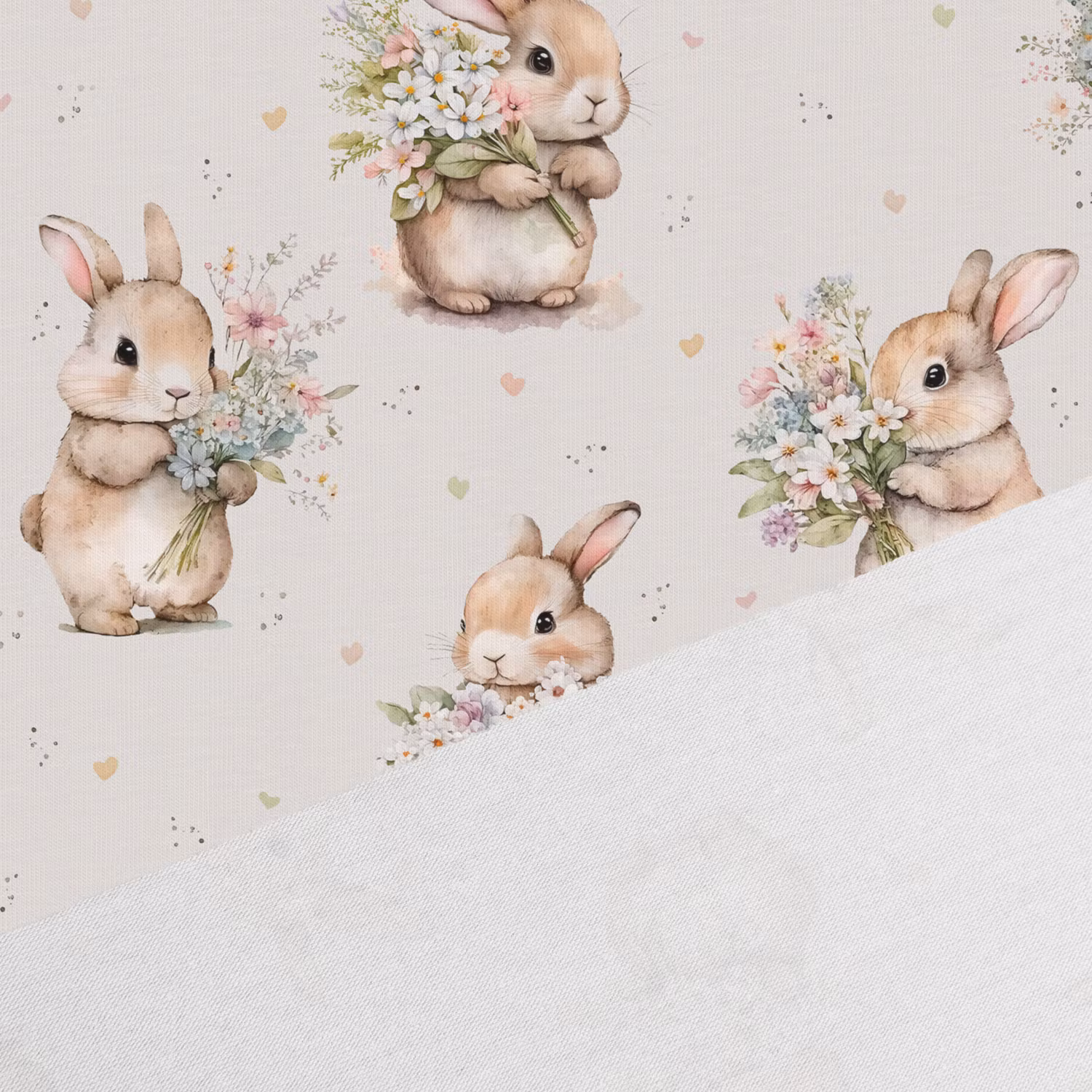 Förtrollande tygmönster med kaniner som håller blombuketter. Perfekt för unika och kreativa sömnadsprojekt och vackra dekorativa ändamål. Mjuk och ela