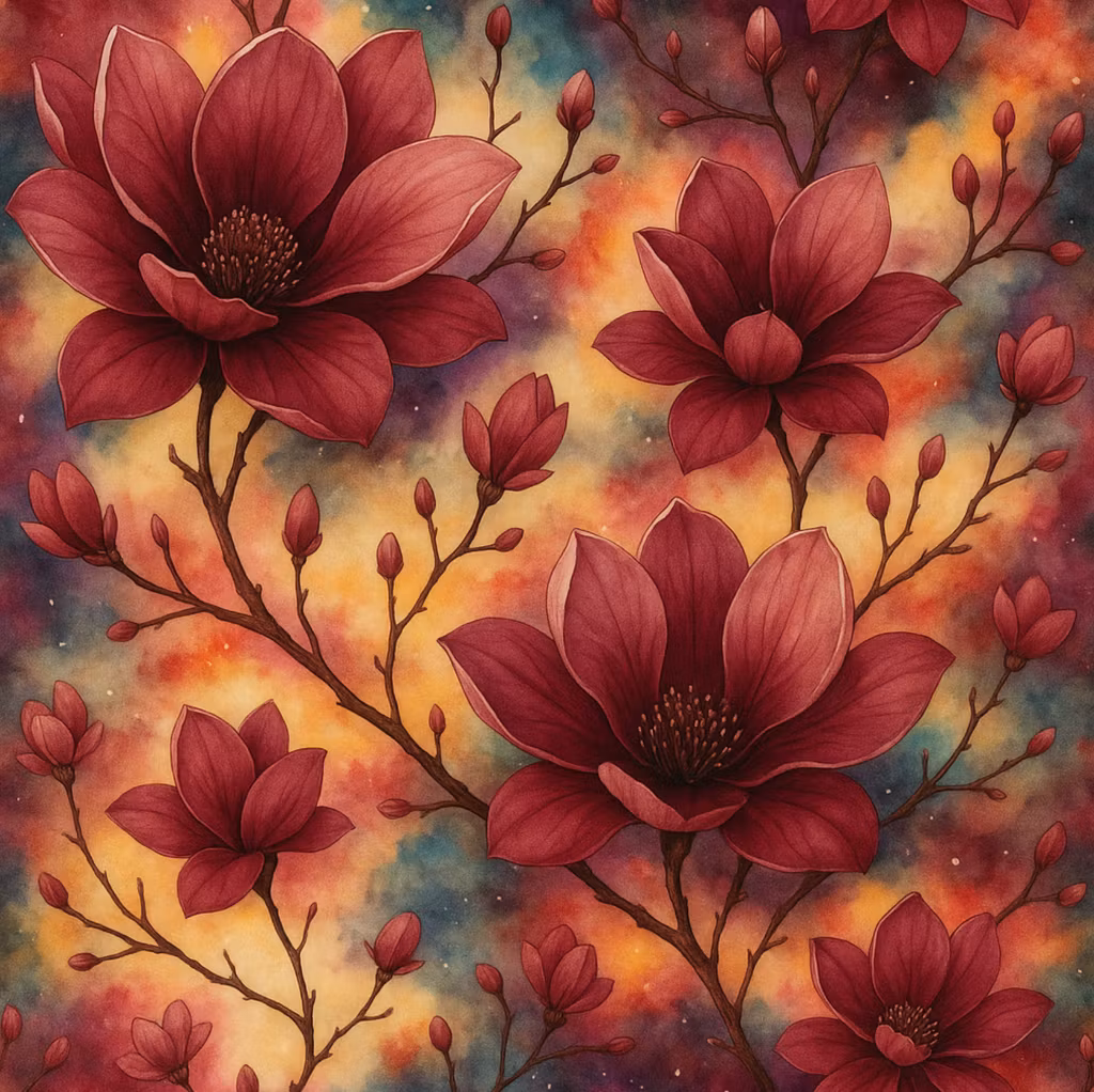 “Aurora Magnolia” är ett sagolikt tyg i öglad jogging / French Terry med stora mörkröda magnoliablommor mot en bakgrund i skimrande toner av guld, blått och bärnsten som ett norrsken i blomning.